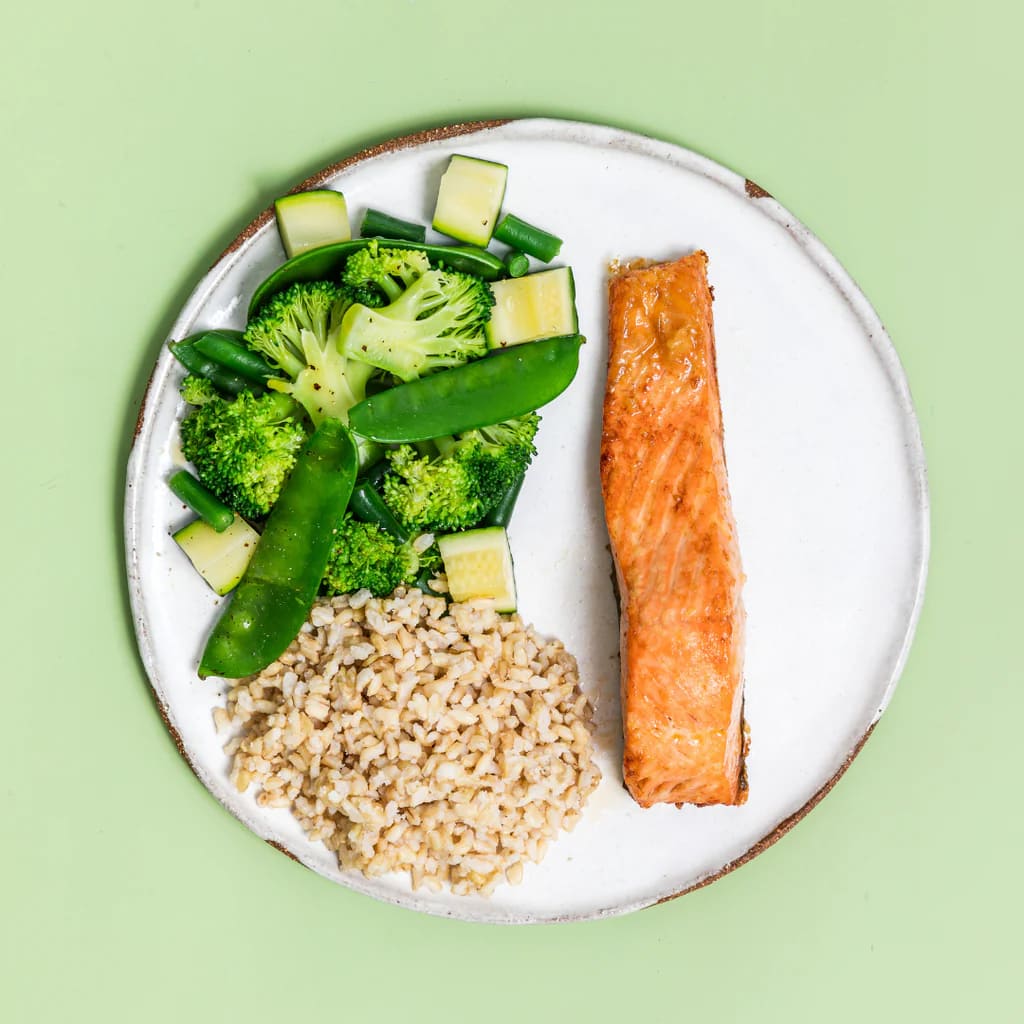 Ora King salmon on a bed of clean brown rice, steamed seasonal greens & a lemon wedge.