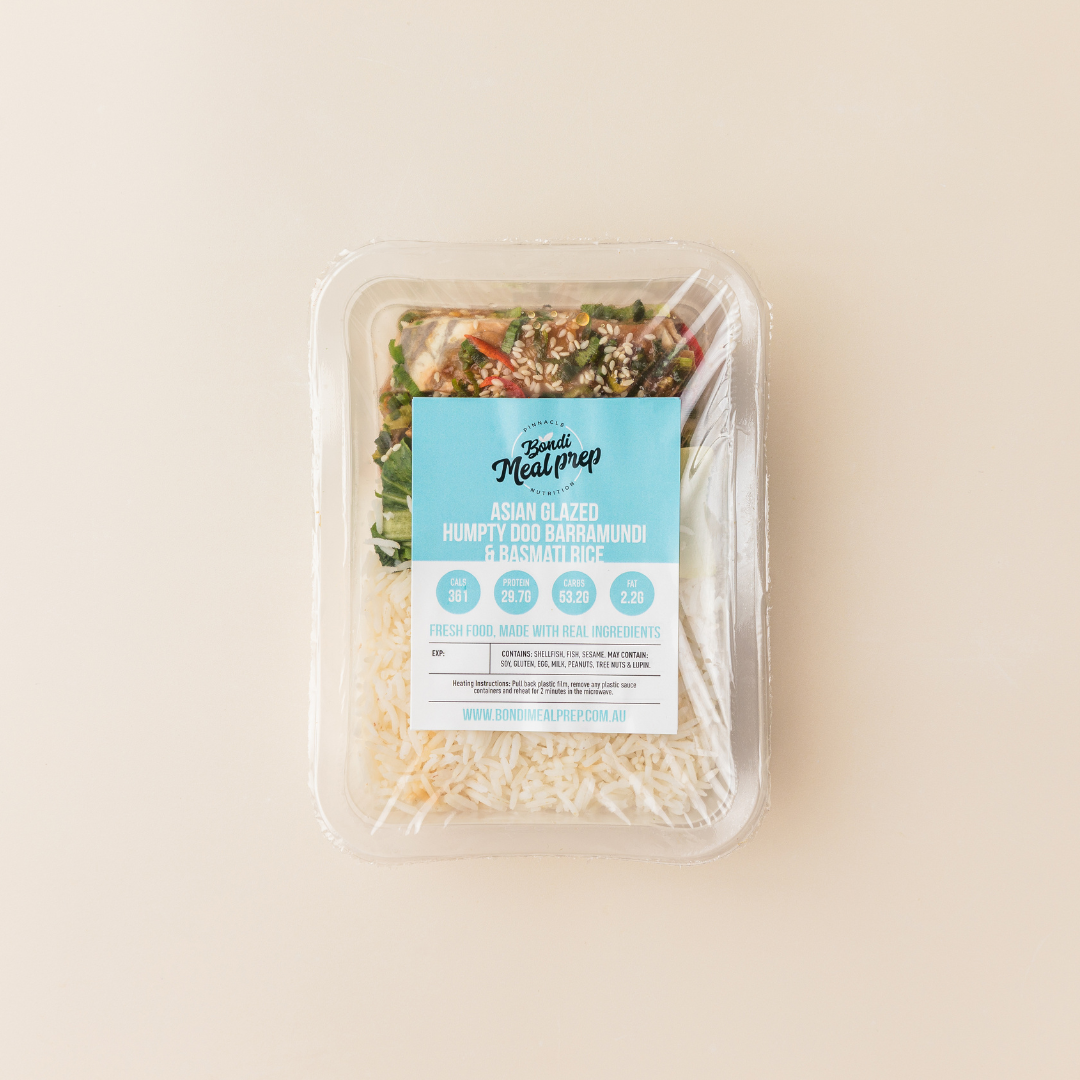 Humpty Doo Barramundi (39.39%)(Contains Fish), Basmati Rice (37.88%), Seasonal Vegetables (13.64%), Asian BBQ Glaze (9.09%)(Potato Starch, Ginger, Garlic, Honey, Pepper, Chilli Paste, Rice Vinegar, Shrimp Paste, Sesame Oil, Organic Tamari (Water, Organic Soy Beans, Sea Salt)(Contains Soy, Sesame, Crustacean), Shallots, Chilli, Sesame Seeds.