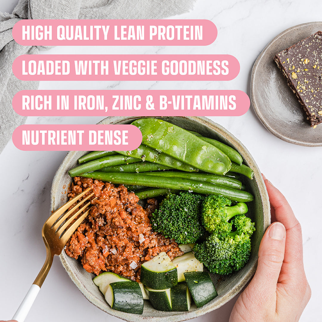We're all about a healthy lifestyle, and this meal gives you the perfect amount of energy and nutrients when you're on the go! We use ultra-lean grass-fed beef mince, cooked in our secret bolognese sauce, and caramelised onions. To finish, we add a serving of fresh steamed seasonal vegetables.