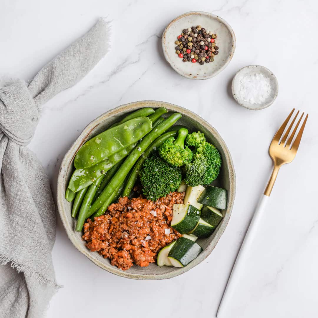 Ultra lean grass fed beef mince with serving of fresh steamed seasonal vegetables.