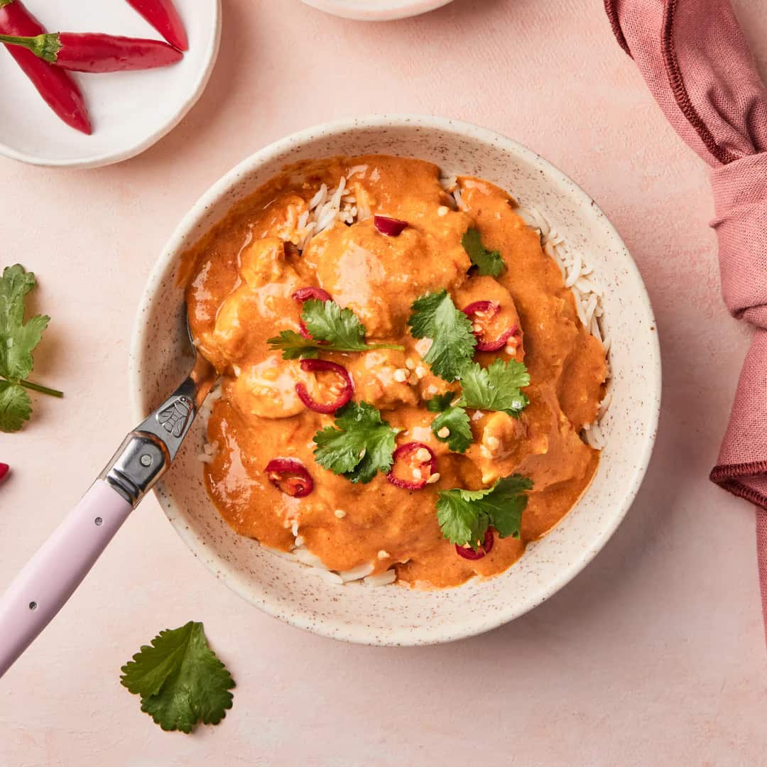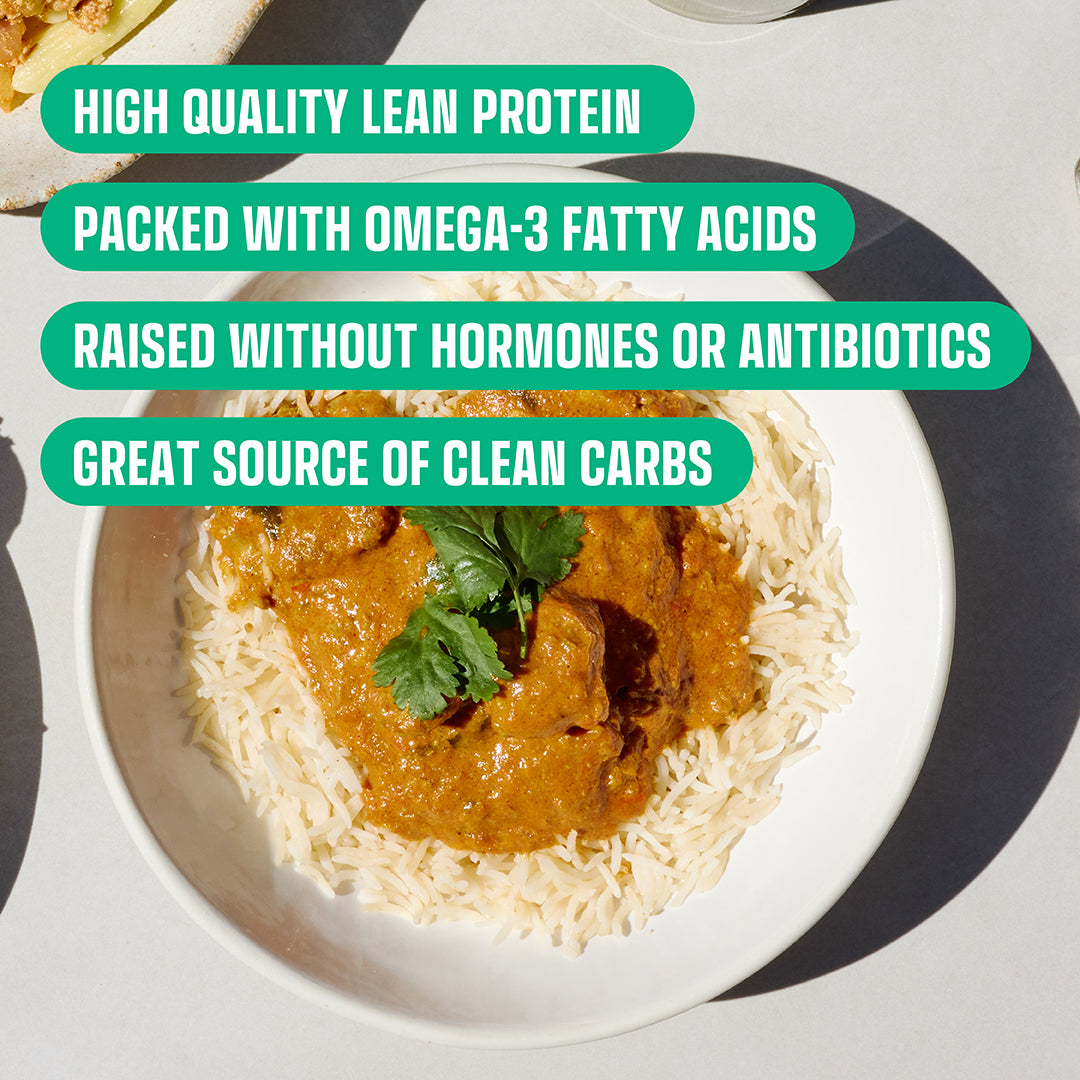 Free range chicken thigh, coated in fragrant spices and curry sauce, on a bed of clean basmati rice.