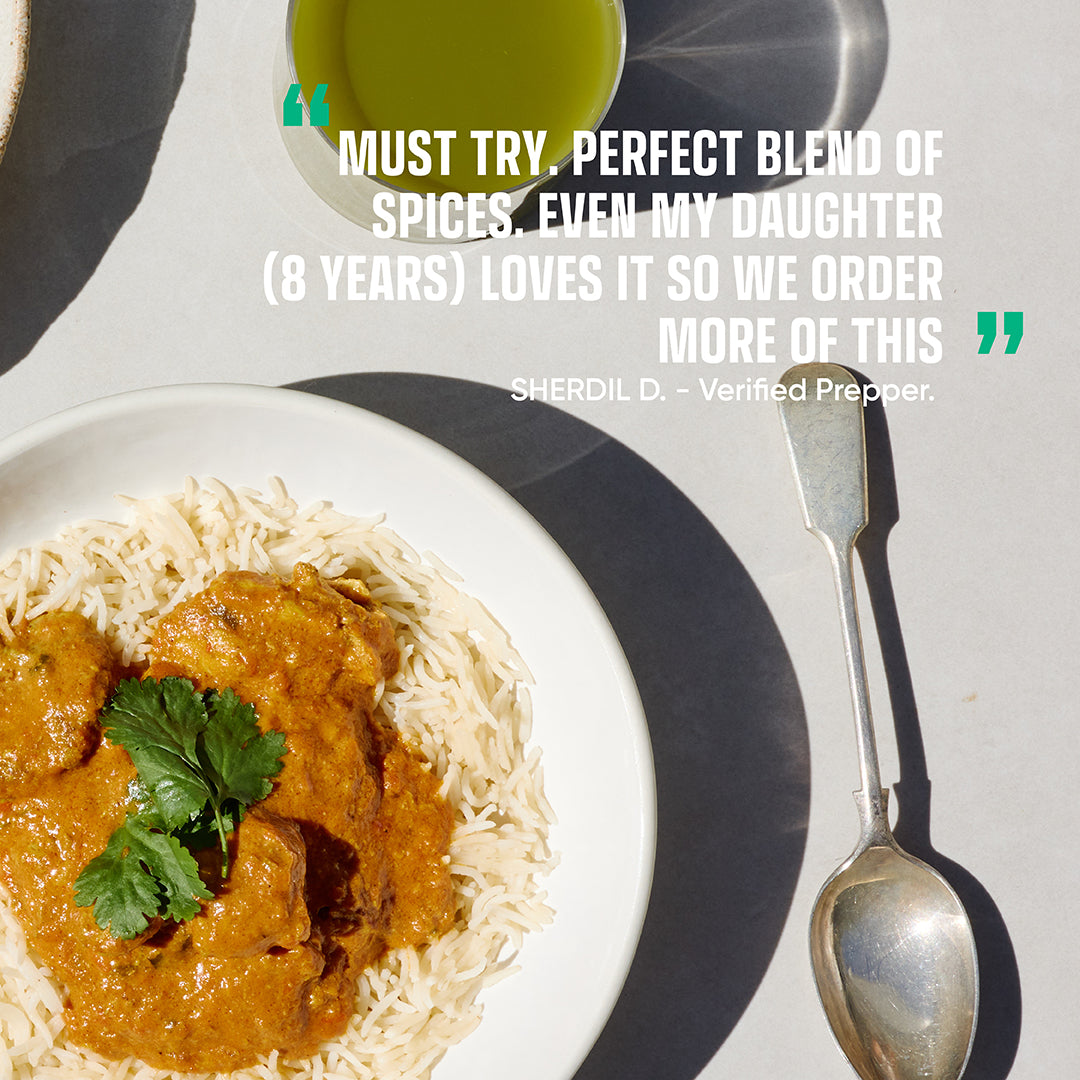 Get ready to indulge in our mouthwatering free-range butter chicken. Tender chicken thighs, marinated in fragrant spices, are served over a bed of fluffy basmati rice and topped with our rich, house-made curry sauce.