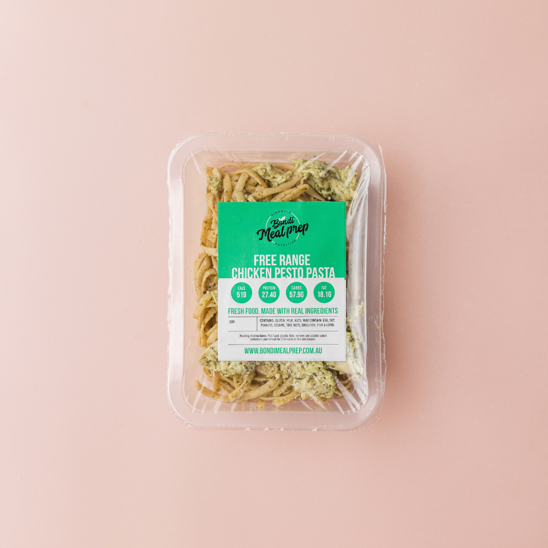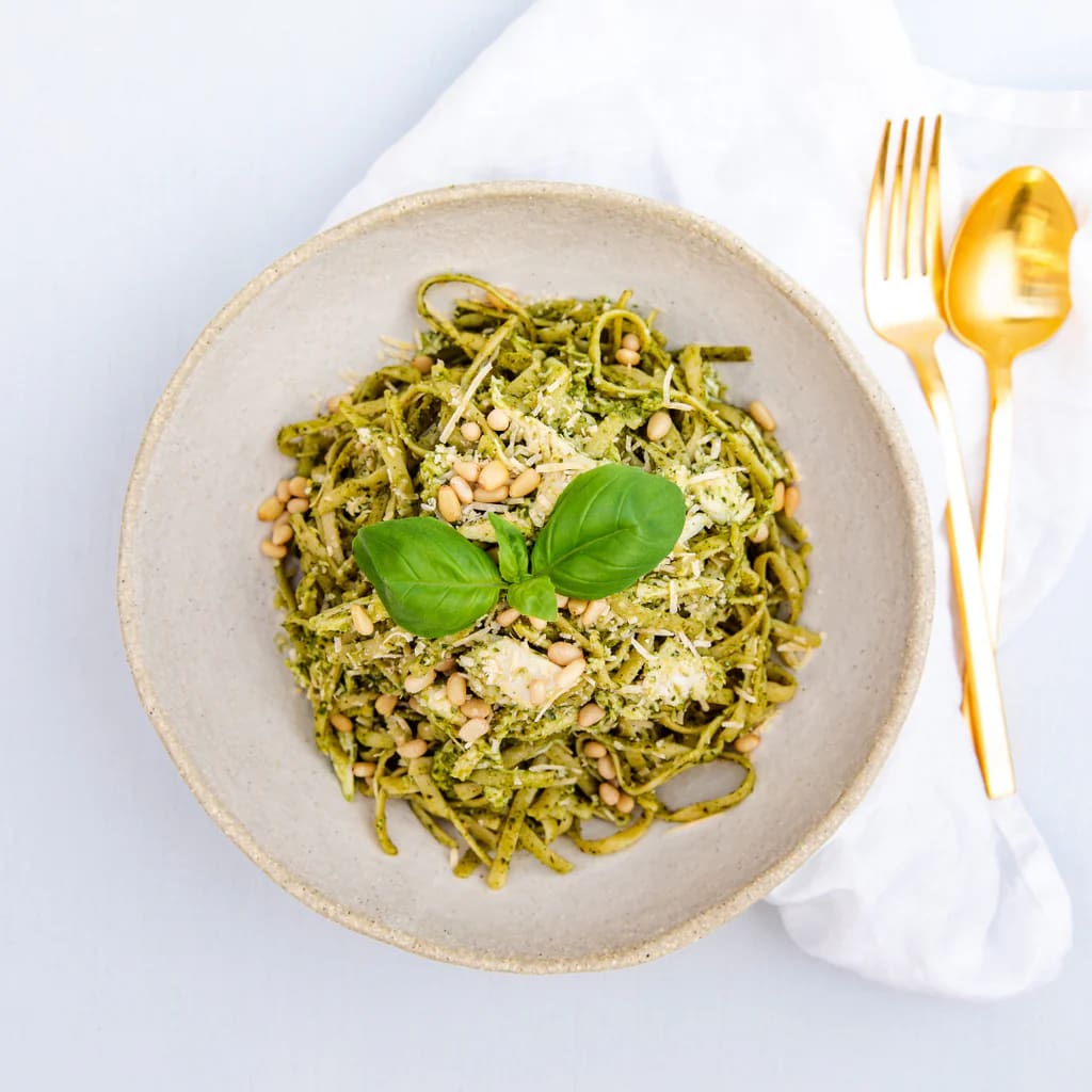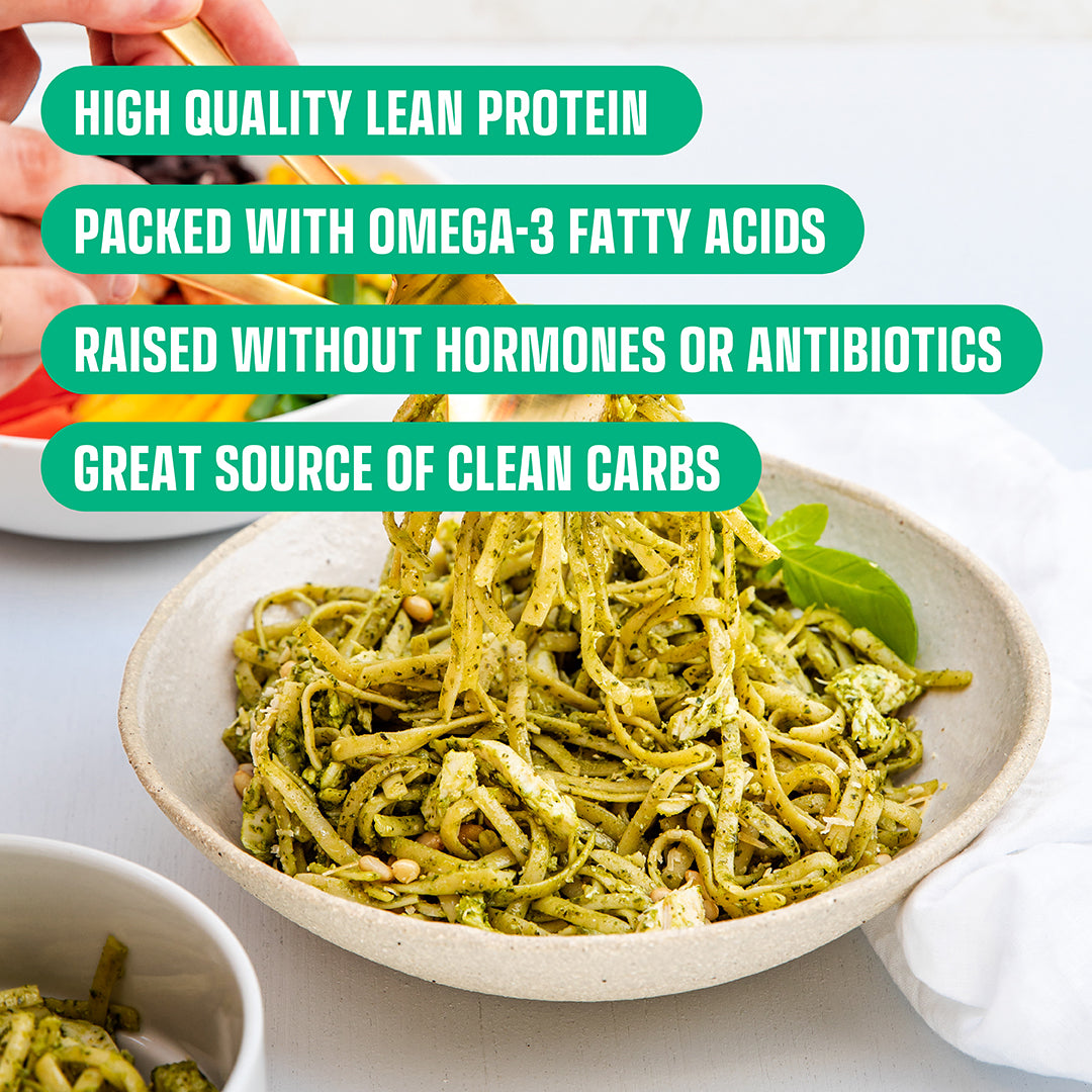 Got a craving for pasta? Our Free-Range Chicken Pesto Pasta is sure to hit the spot! This hearty dish features authentic Italian linguine tossed with a vibrant blend of fresh basil, garlic, and pine nuts. We mix in tender free-range chicken breast and top it all off with a generous sprinkle of grated parmesan cheese.