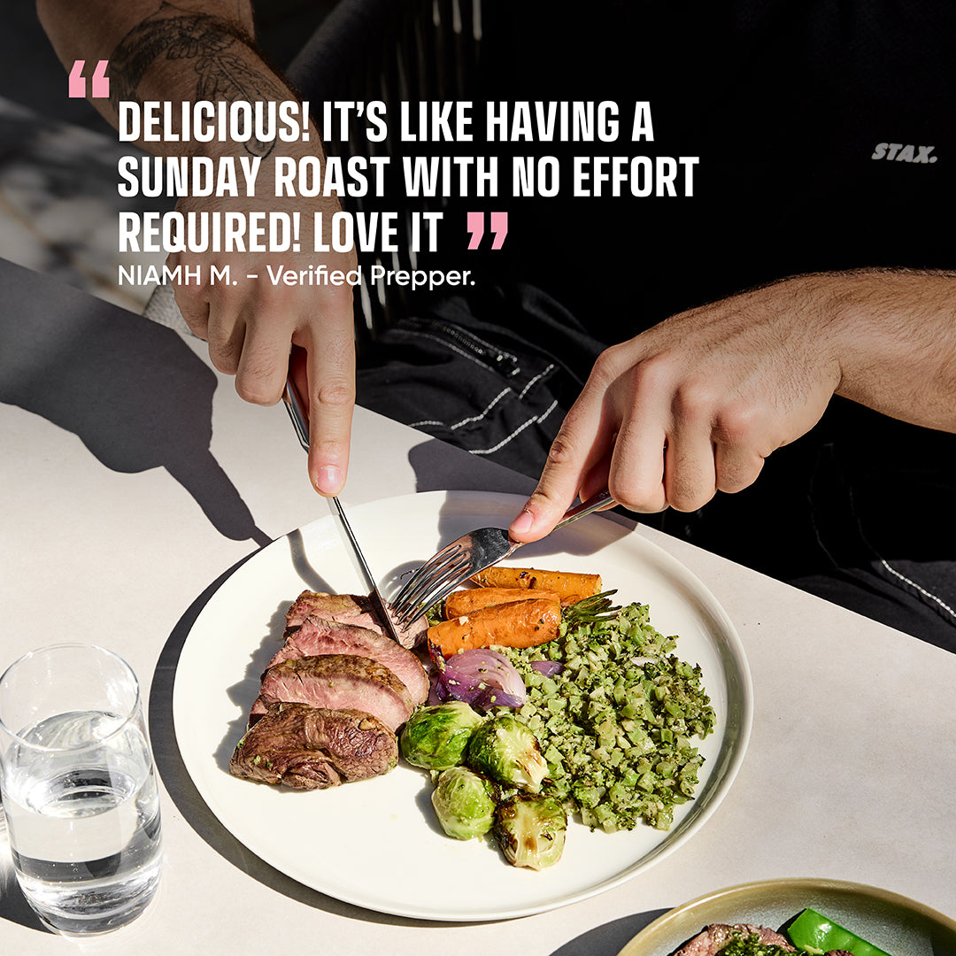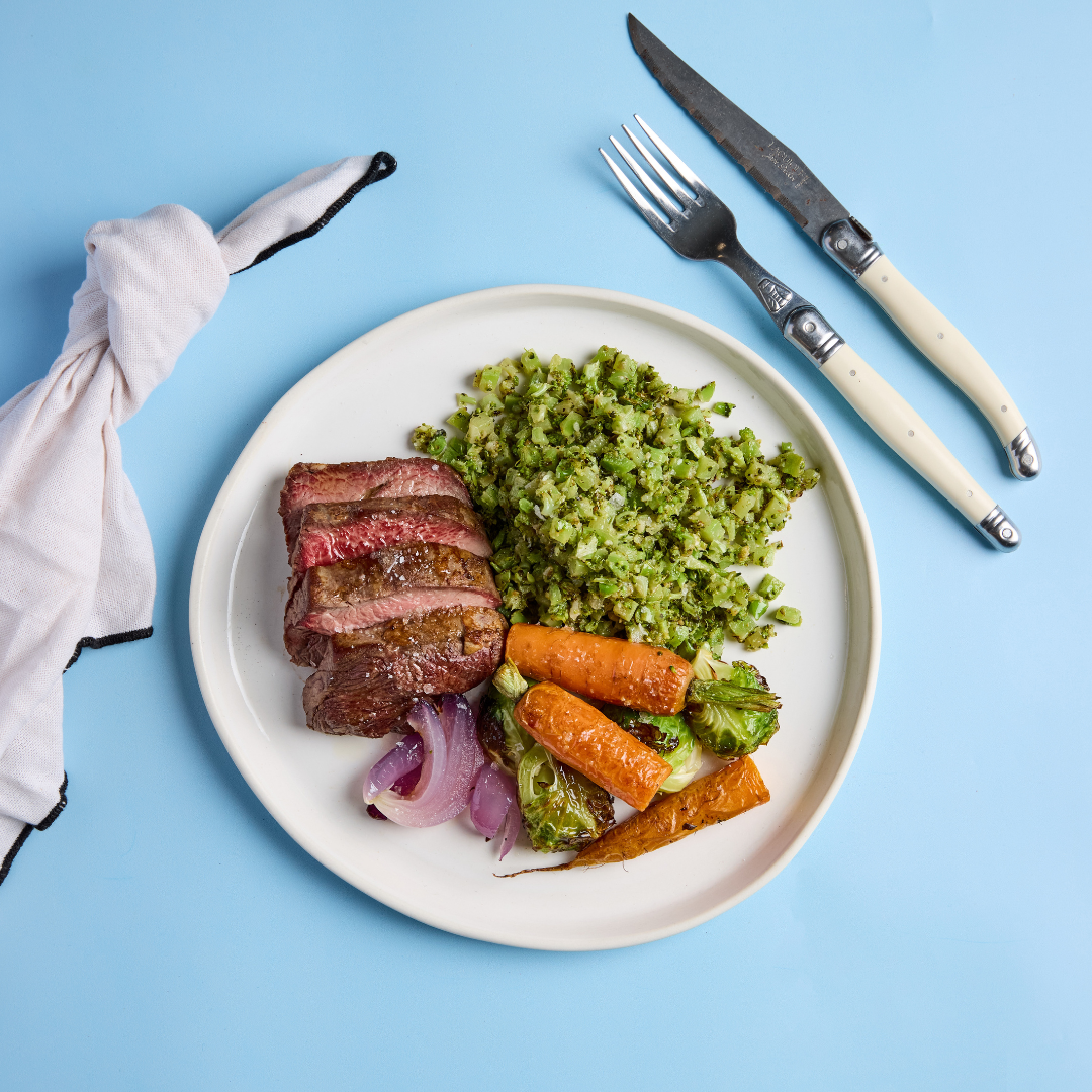 Indulge in our succulent grass-fed lamb, seasoned and cooked to perfection. This meal is served alongside fluffy broccoli rice and a side of vibrant roasted seasonal vegetables. This wholesome, nutrient-packed meal is the perfect combination of fresh, high-quality ingredients and balanced flavors.