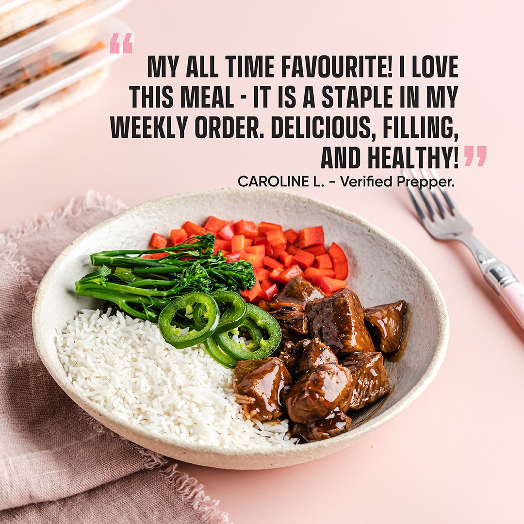 Elevate your protein game and treat your tastebuds to a bold burst of flavour! Our Grass-Fed Steak Bowl is marinated for 24 hours in our signature house-made smoky BBQ sauce, then char-grilled to perfection. It's served with fluffy basmati rice, tender steamed broccolini, roasted capsicum, and jalapeños.