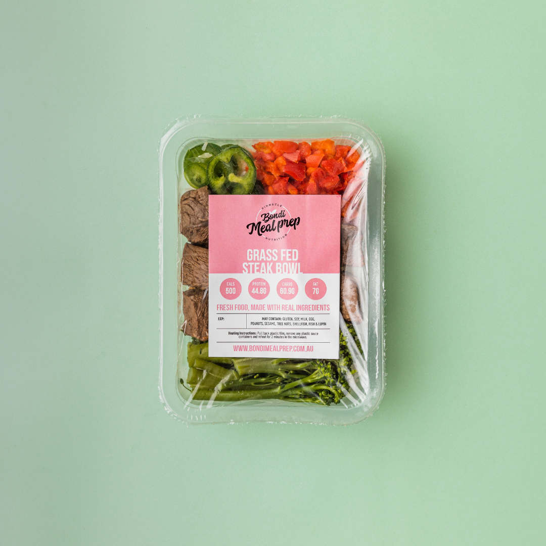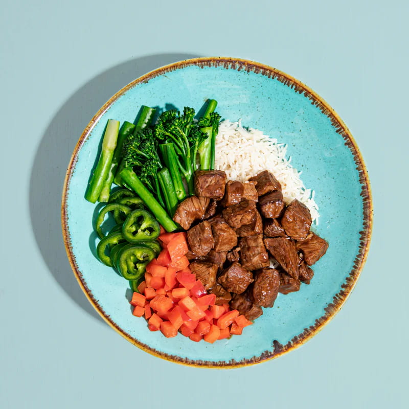 Grass-Fed Steak Bowl served with basmati rice, broccolini, roasted capsicum, and jalapeños.