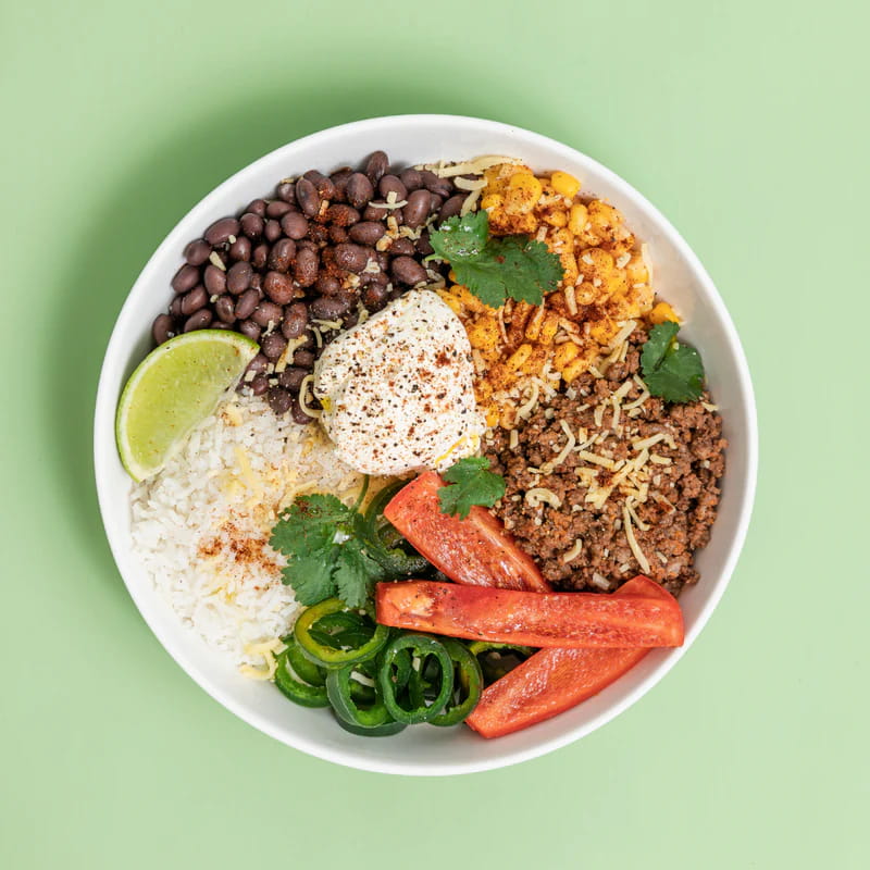 Grass fed beef mince with cilantro basmati rice, chilli corn, black beans, capsicum, and cheddar cheese.