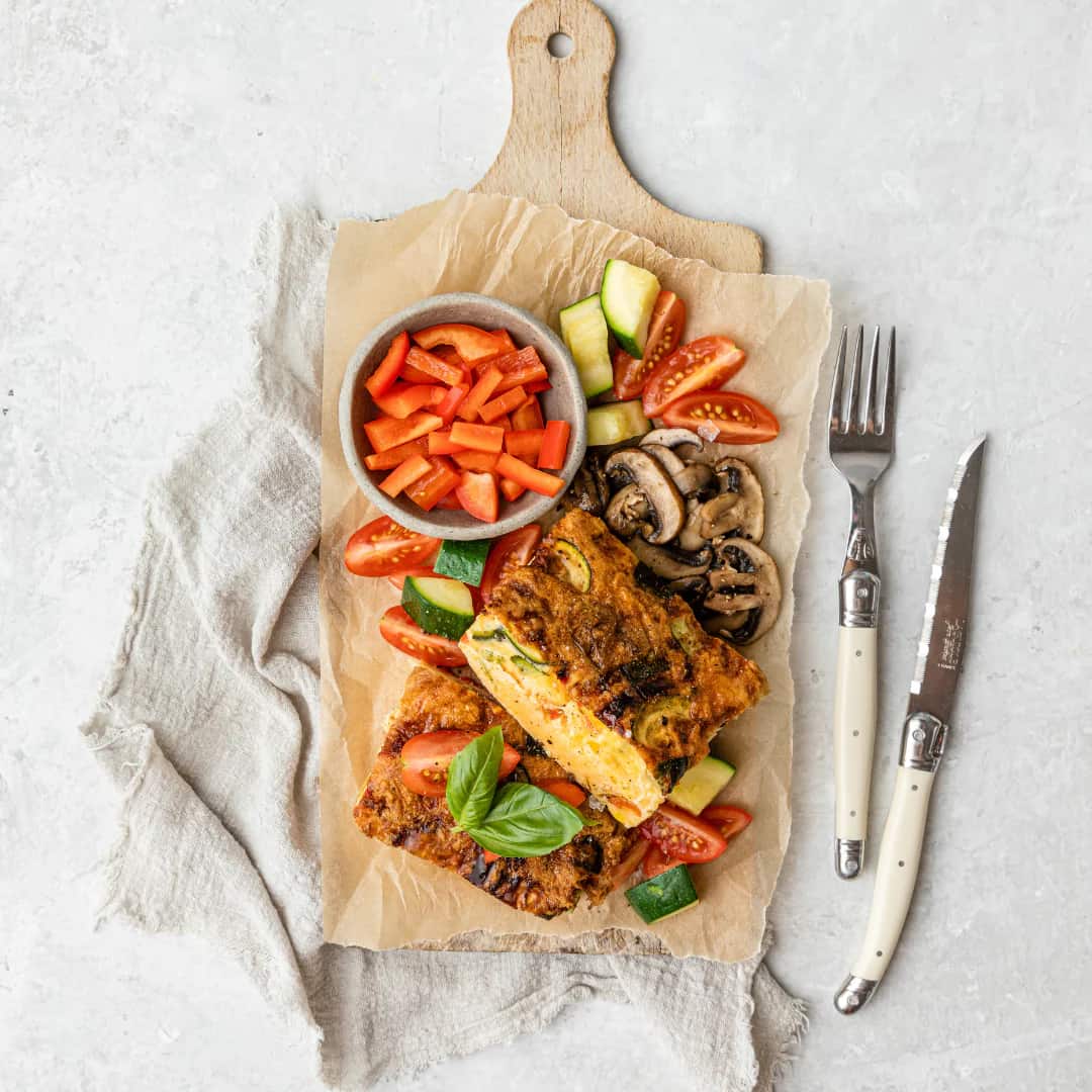 Breakfast frittata made with free-range eggs, a medley of oven baked veggies and light cheese.