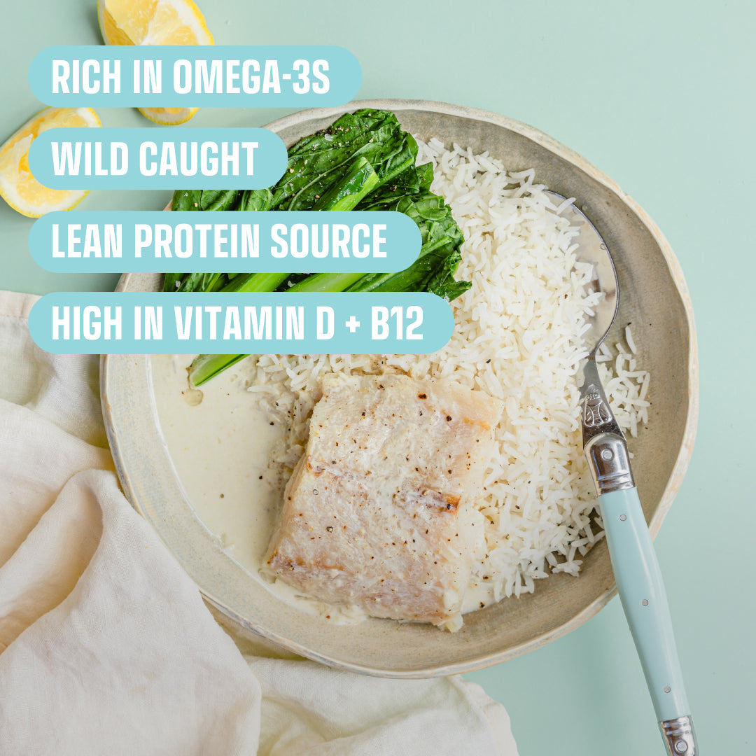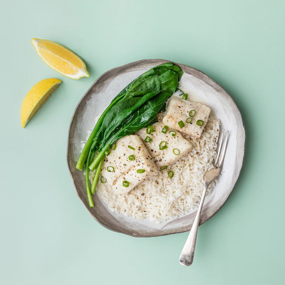 Wild caught hoki fish, on a bed of clean basmati rice, chinese broccoli & green curry sauce.