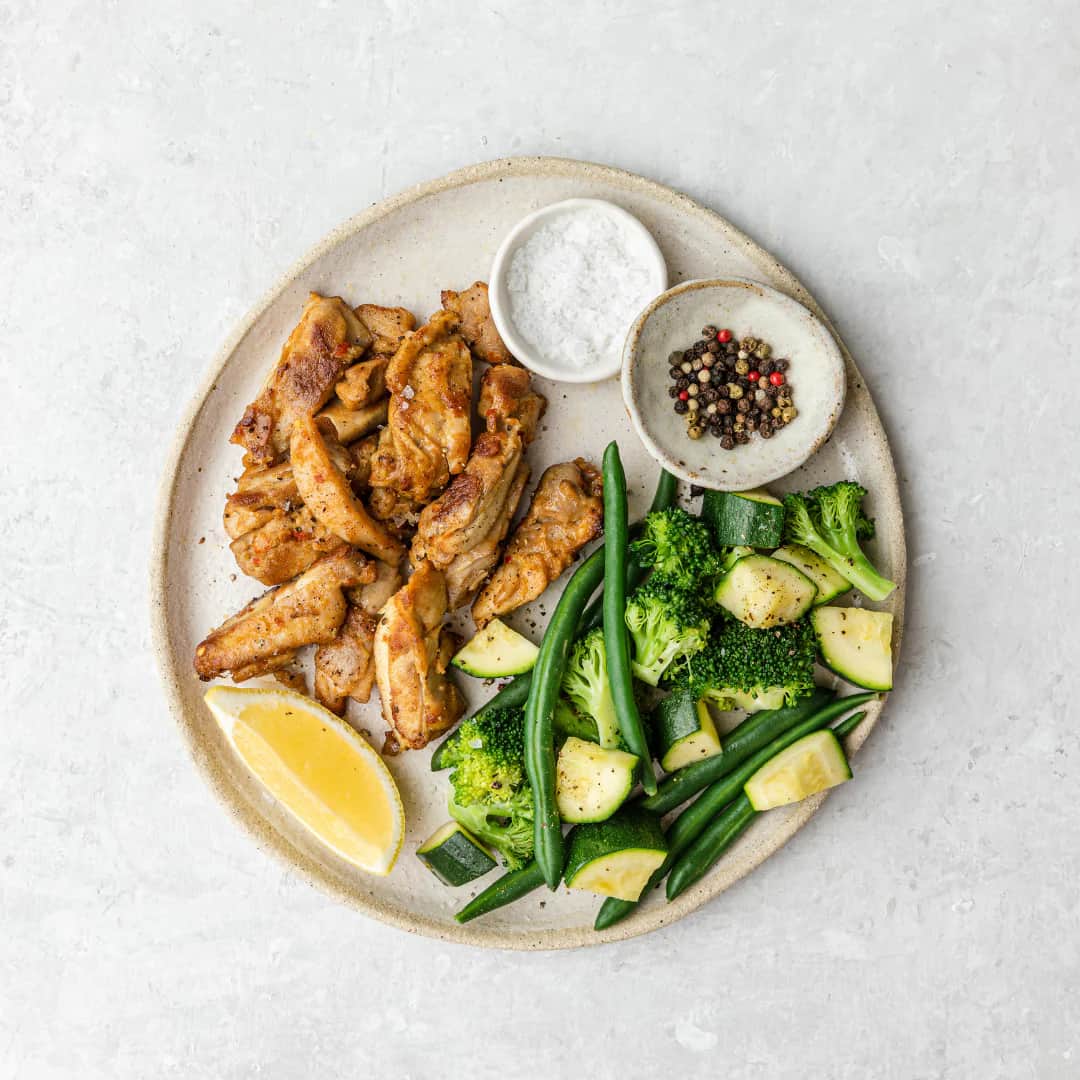 Succulent free range chicken thigh fillets with a side of fresh steamed seasonal vegetables.